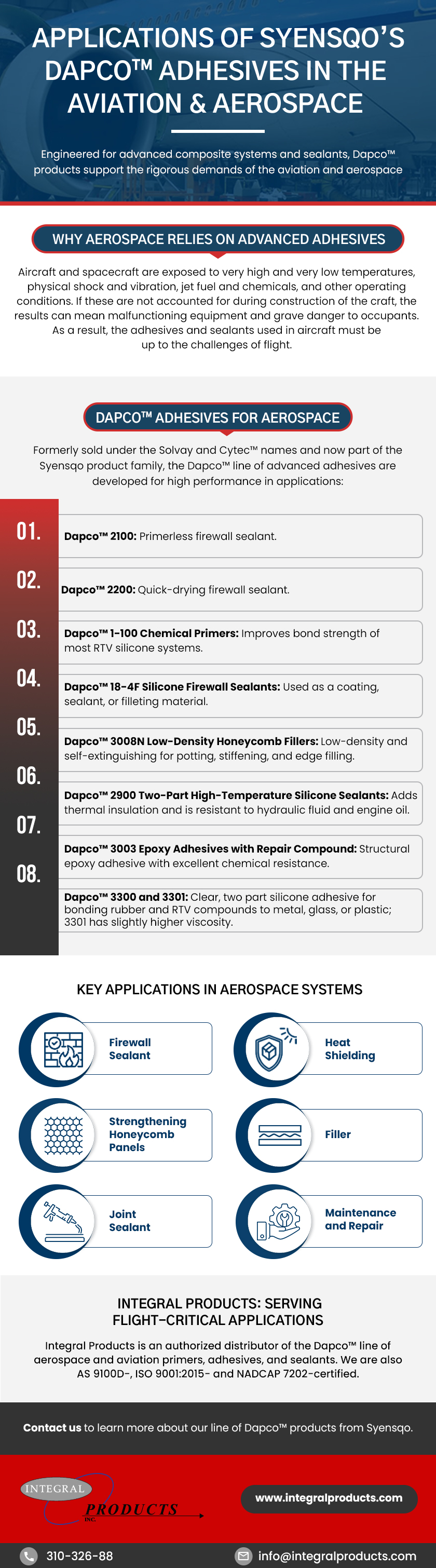 Engineered for advanced composite systems and sealants, Dapco™ products support the rigorous demands of the aviation and aerospace sectors. Learn more about these adhesives, their benefits for aviation and aerospace applications, and how authorized Dapco™ distributor Integral Products meets flight-critical needs with these advanced adhesives.